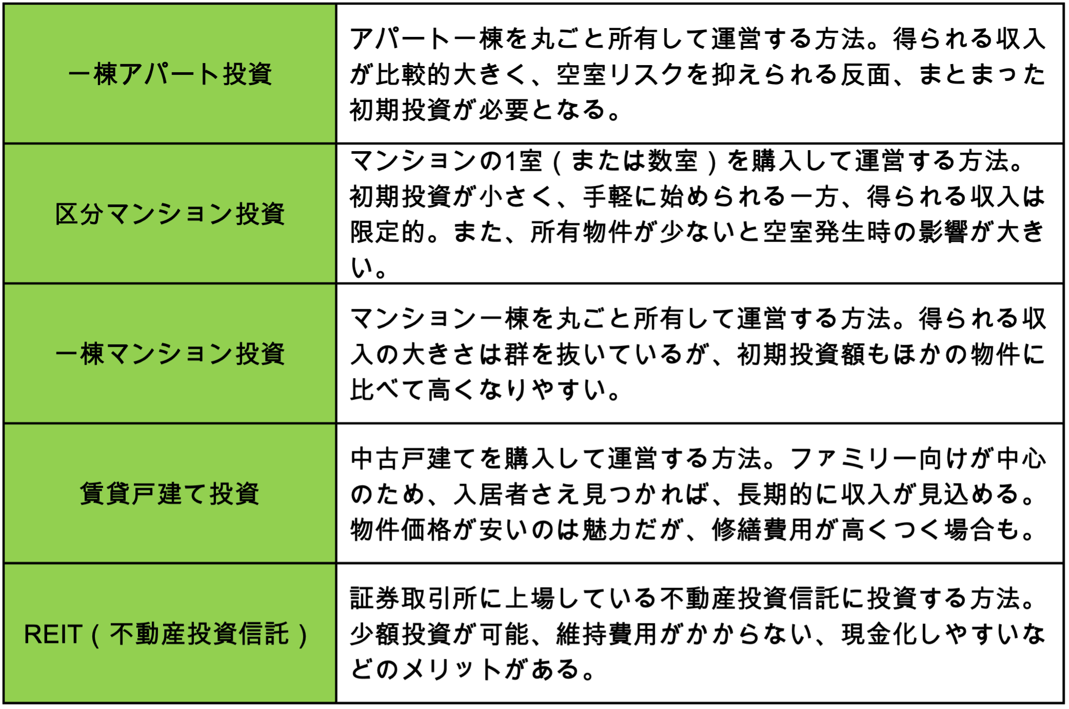 不動産投資と一口にいっても、投資する物件や商品の種類ごとに特徴が異なります。