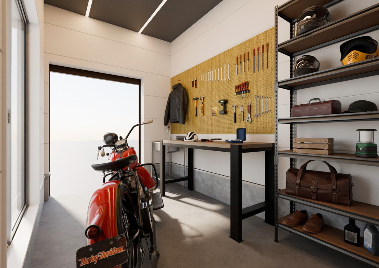バイクガレージをイメージした3rdプレイスには、電動シャッター、ガーデンシンク、パンチングボード、換気扇を設置し、バイカーの皆様が夢見るガレージルームを実現しました。