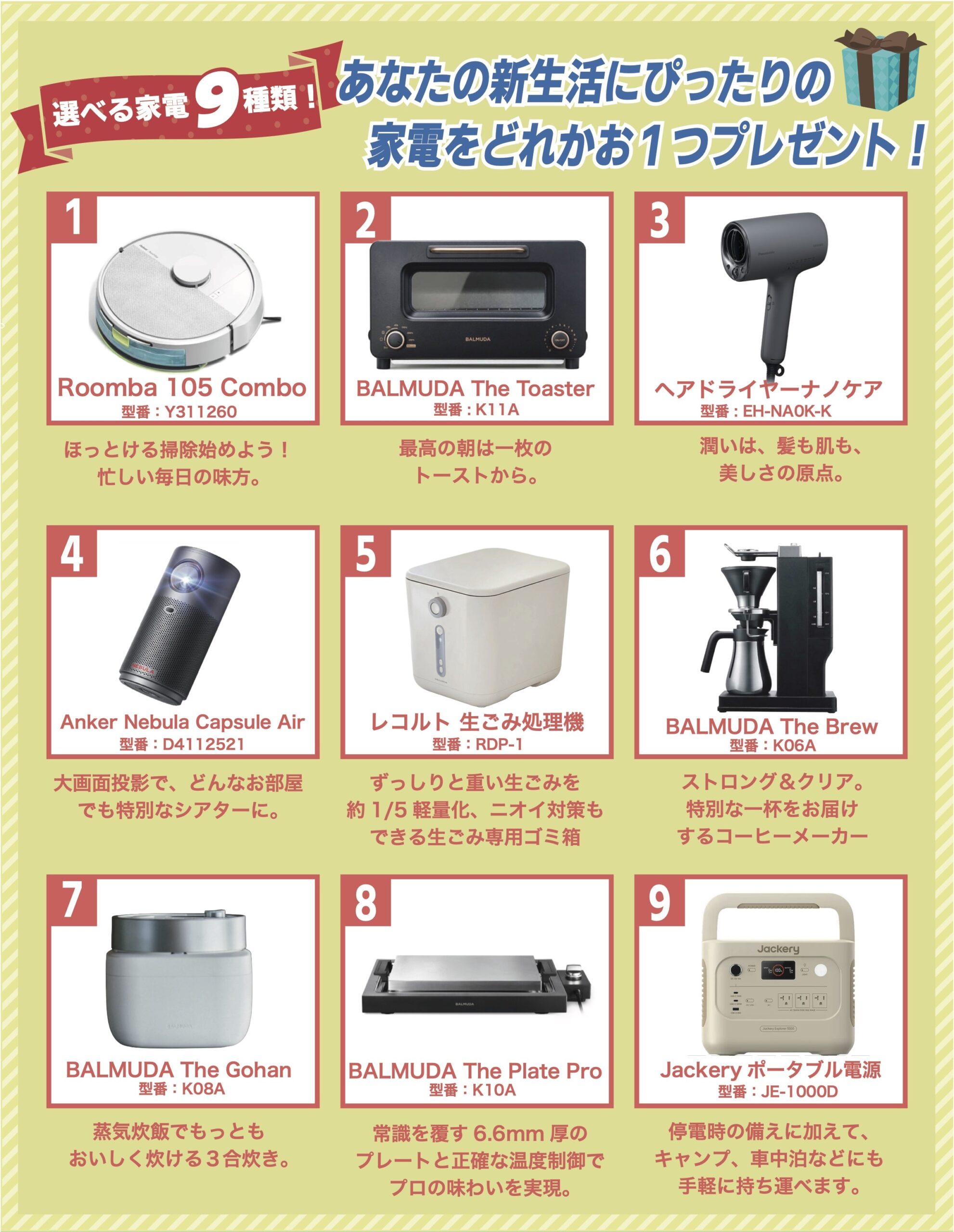 2026年1月4日〜3月31日の期間中、横浜スタイルからマイホームをご成約いただいたお客様全員に、9種類の人気家電からお好きな1点をプレゼントいたします!ルンバやバルミューダなど、豪華ラインナップをご用意しております。このチャンスにぜひ理想の住まい探しを。お気軽にお問い合わせください!